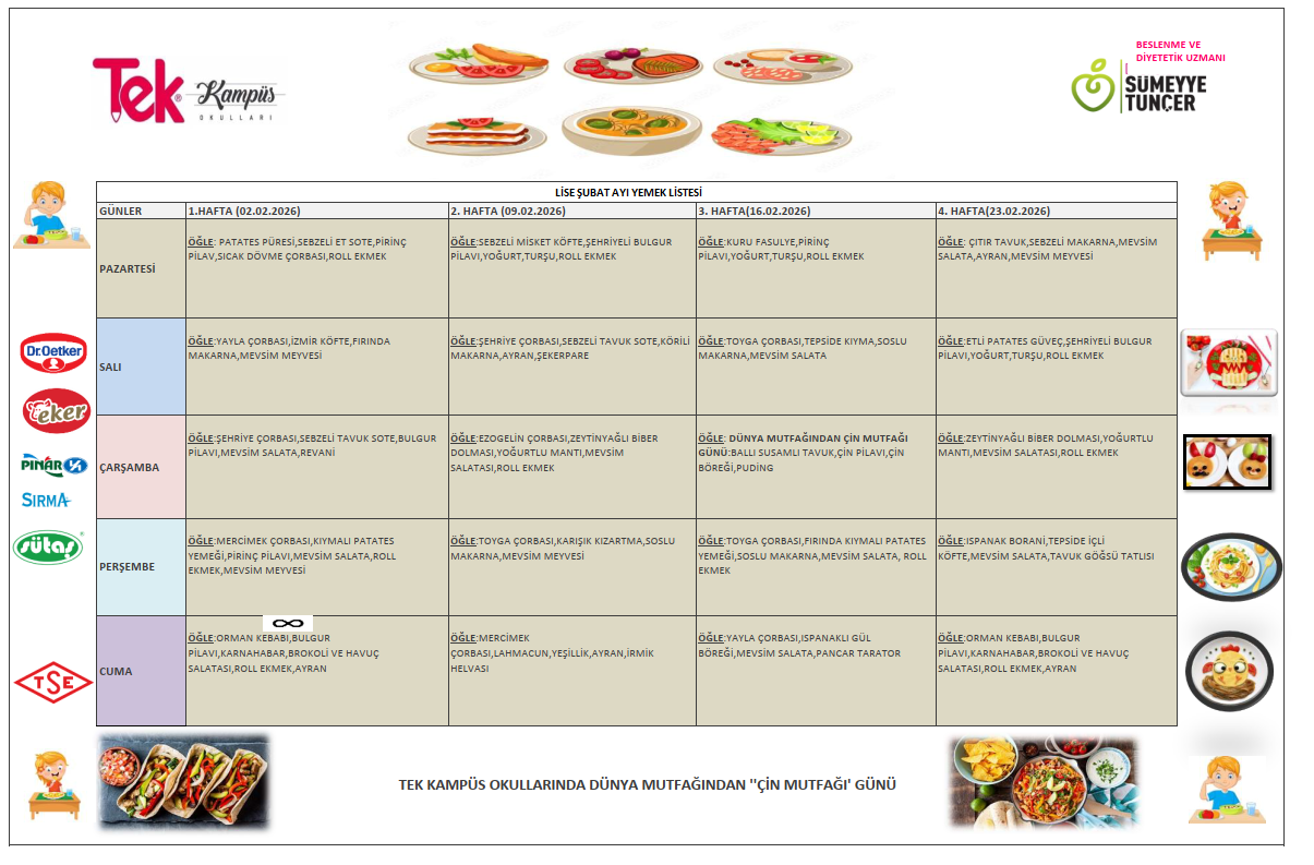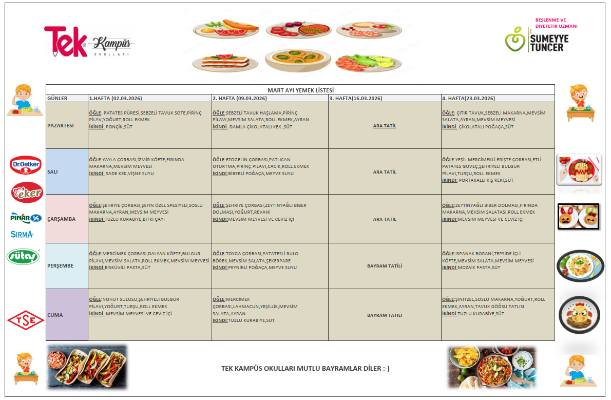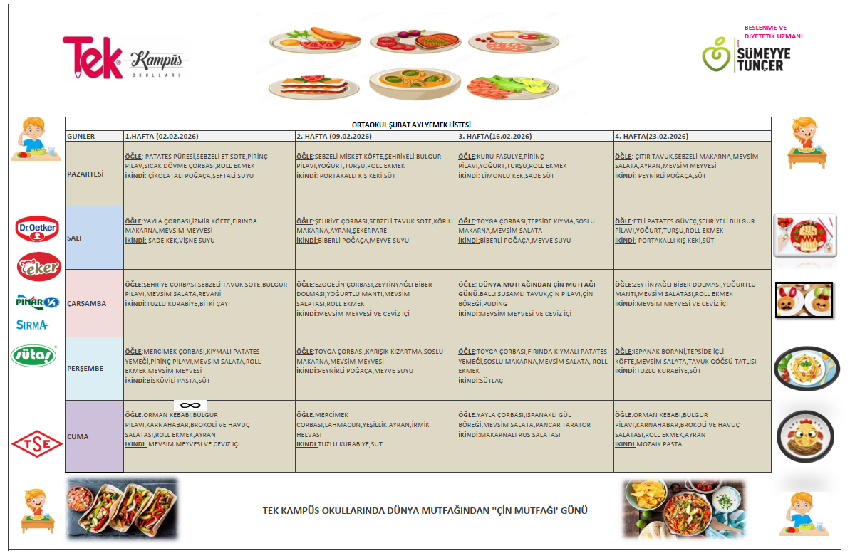 Tek Kampüs Okulları – Yemek Hizmetleri Tek Kampüs Okulları olarak öğrencilerimizin sağlıklı, dengeli ve hijyenik beslenmesini ön planda tutuyoruz. Okul yemekhanemizde günlük olarak taze hazırlanan öğünler, uzman diyetisyen kontrolünde oluşturulan menülerle sunulmaktadır. Her ay yenilenen aylık yemek listemiz, öğrencilerimizin yaş gruplarına uygun besin değerleri dikkate alınarak planlanır ve velilerimizin rahatlıkla takip edebilmesi için düzenli olarak web sitemizde yayımlanır. Yemek hizmetlerimizde hijyen kurallarına titizlikle uyulmakta, kullanılan tüm ürünler güvenilir tedarikçilerden temin edilmektedir. Amacımız, öğrencilerimizin hem sağlıklı beslenmesini sağlamak hem de doğru beslenme alışkanlıkları kazanmalarına katkıda bulunmaktır.