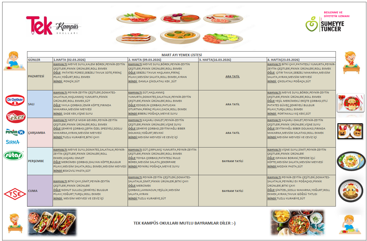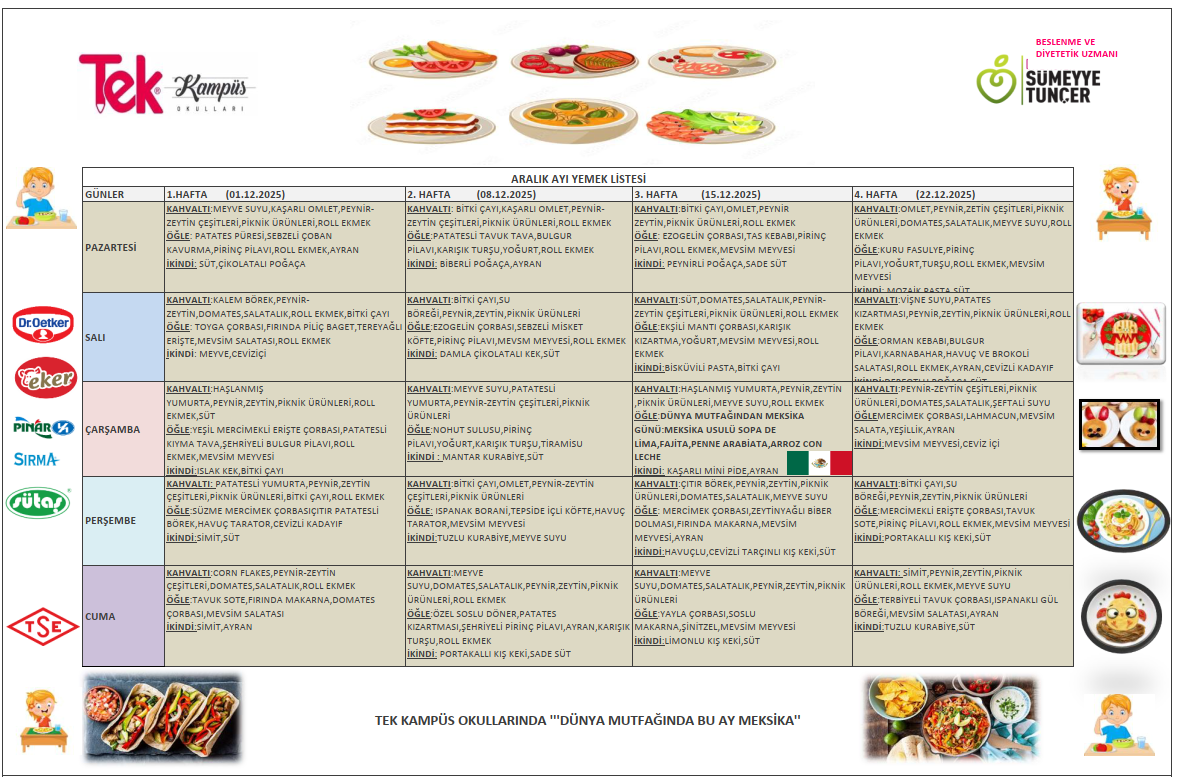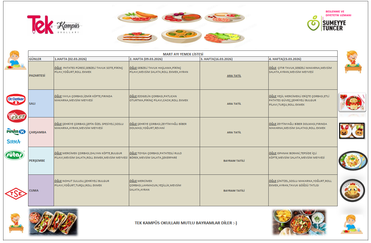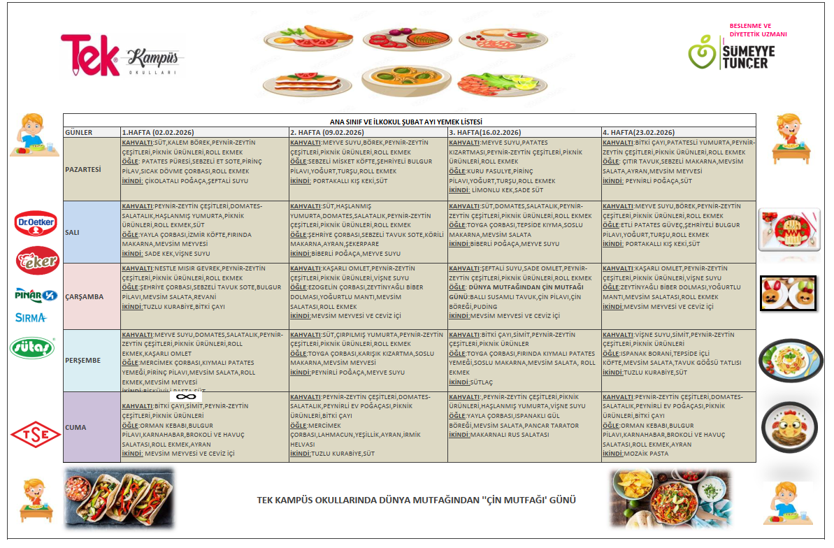 Tek Kampüs Okulları – Yemek Hizmetleri Tek Kampüs Okulları olarak öğrencilerimizin sağlıklı, dengeli ve hijyenik beslenmesini ön planda tutuyoruz. Okul yemekhanemizde günlük olarak taze hazırlanan öğünler, uzman diyetisyen kontrolünde oluşturulan menülerle sunulmaktadır. Her ay yenilenen aylık yemek listemiz, öğrencilerimizin yaş gruplarına uygun besin değerleri dikkate alınarak planlanır ve velilerimizin rahatlıkla takip edebilmesi için düzenli olarak web sitemizde yayımlanır. Yemek hizmetlerimizde hijyen kurallarına titizlikle uyulmakta, kullanılan tüm ürünler güvenilir tedarikçilerden temin edilmektedir. Amacımız, öğrencilerimizin hem sağlıklı beslenmesini sağlamak hem de doğru beslenme alışkanlıkları kazanmalarına katkıda bulunmaktır.
