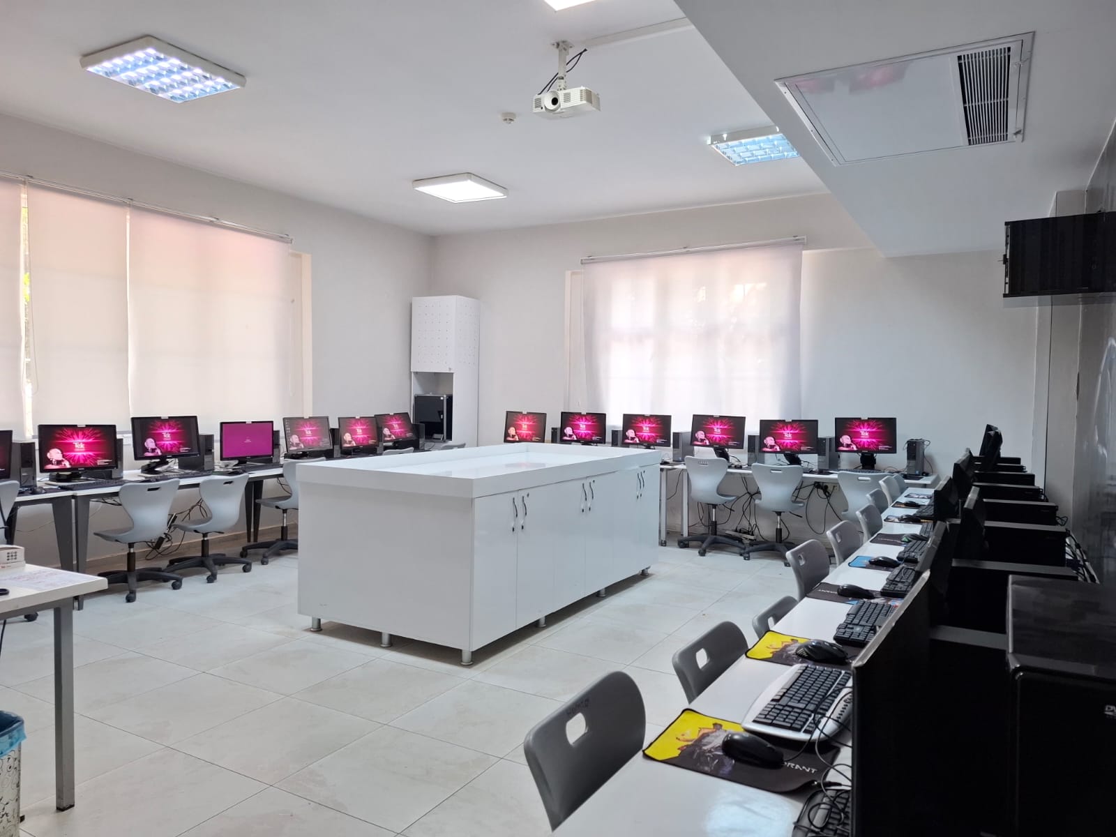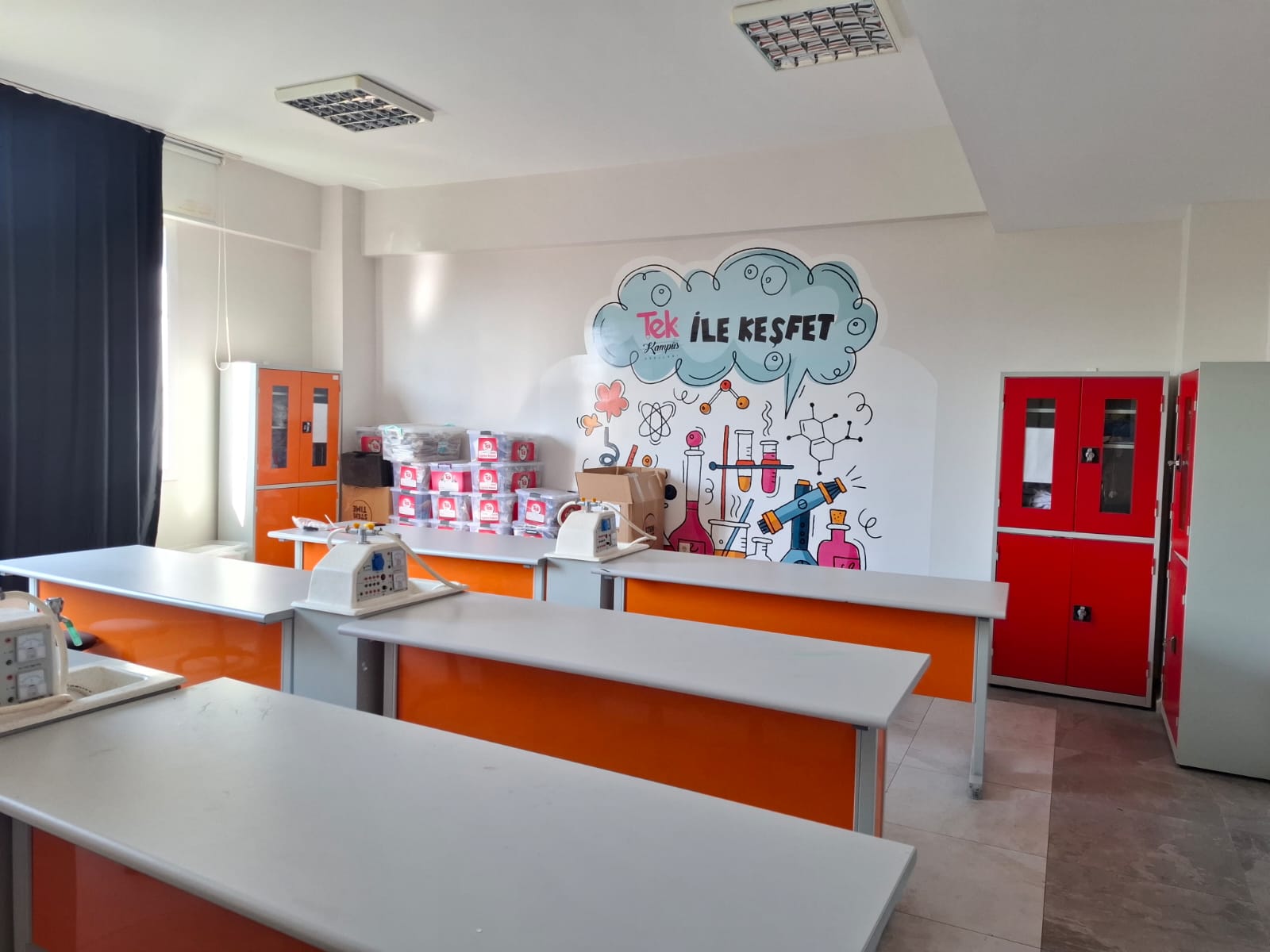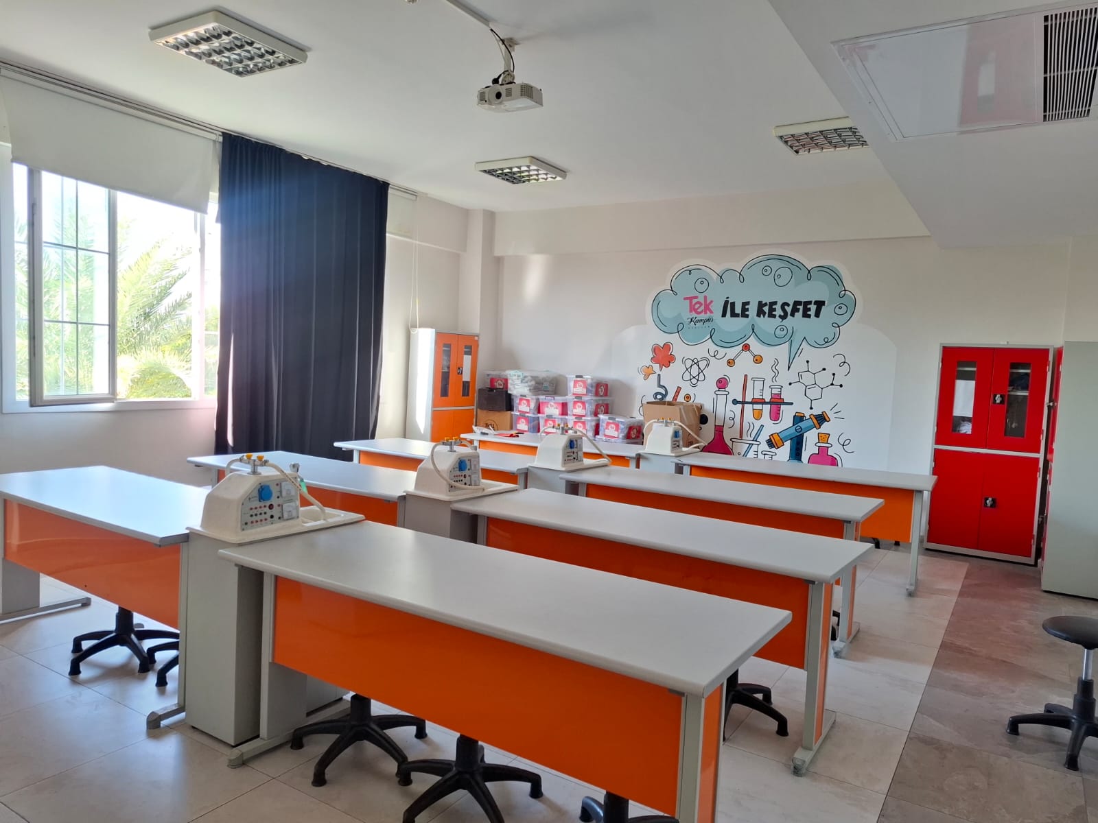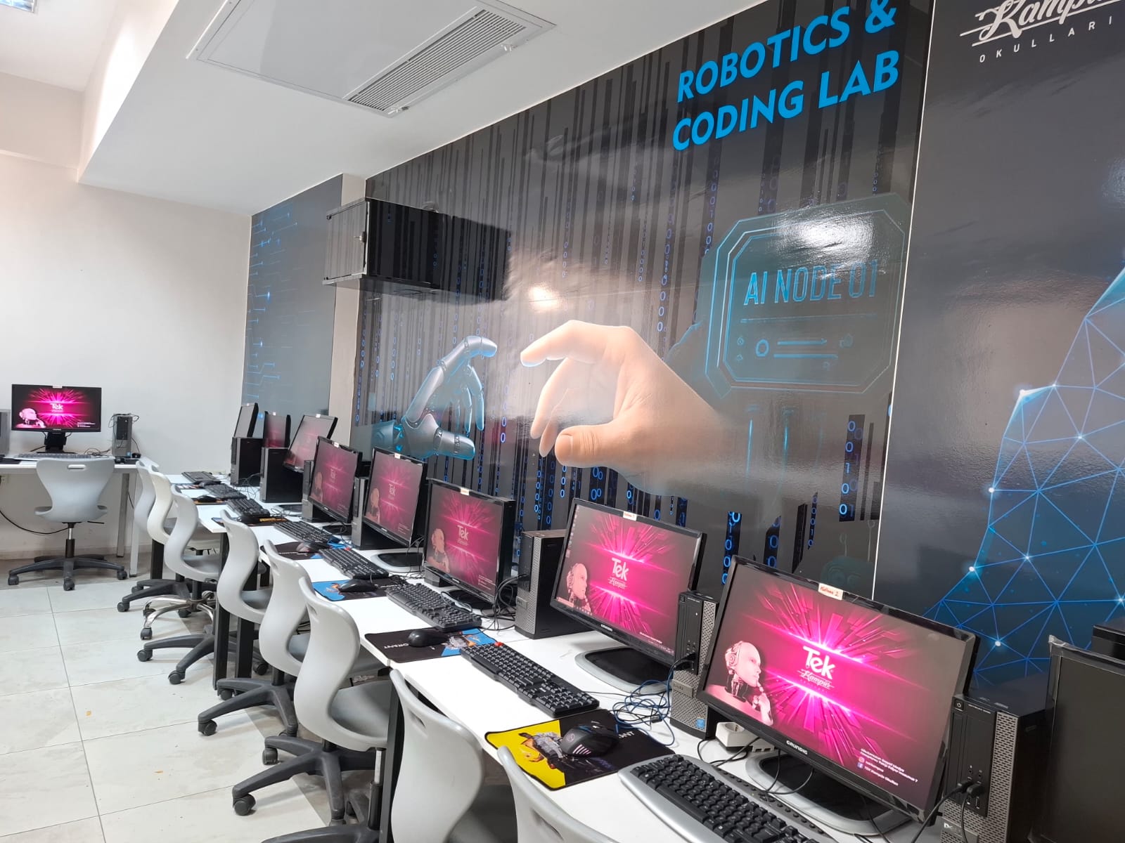 Tek Kampüs Okulları – Teknoloji ve Bilim Öğrenme Alanları Bilgisayar Laboratuvarı Tek Kampüs Okulları’nda öğrencilerimizin dijital becerilerini geliştirmeleri için modern ve donanımlı bir bilgisayar sınıfı bulunmaktadır. Güncel yazılımlar, hızlı internet altyapısı ve bireysel çalışma imkânı sayesinde öğrencilerimiz teknoloji okuryazarlığını üst seviyede deneyimleyerek öğrenim görmektedir. Bilişim dersleri, proje çalışmaları ve dijital uygulamalar bu ortamda etkin bir şekilde yürütülmektedir. Geleceğin teknolojilerini bugünden deneyimleten robotik ve kodlama atölyemiz; öğrencilerimizin algoritmik düşünme, problem çözme, yaratıcılık ve takım çalışması becerilerini geliştirmelerine olanak tanır. LEGO eğitim setleri, sensörler, mikrodenetleyiciler ve çeşitli yazılım araçlarıyla öğrencilerimiz, kendi projelerini tasarlayıp hayata geçirebilmektedir. Atölyemiz, STEM odaklı eğitim anlayışımızın önemli bir parçasıdır. Fen Laboratuvarı Fen bilimleri derslerini teoriden pratiğe taşıyan modern fen laboratuvarımız; güvenli ekipmanlar, deney setleri ve uygulama alanları ile öğrencilerimize deney yapma fırsatı sunar. Öğrencilerimiz fizik, kimya ve biyoloji konularını gözlemleyerek öğrenir, bilimsel süreç becerilerini geliştirme imkânı bulur. Laboratuvarımız, araştırma ve keşif temelli öğrenmeyi destekleyen bir ortam sağlar.